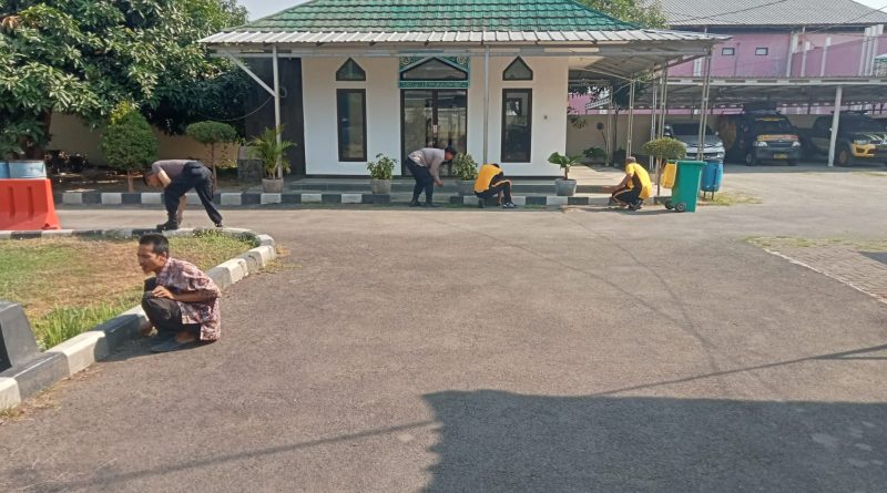 Sumber-Anggota Polsek Sumber Polresta Cirebon melaksanakan giat Korve bersih-bersih lingkungan sekitar Mako, Jum’at (27/10/2023).