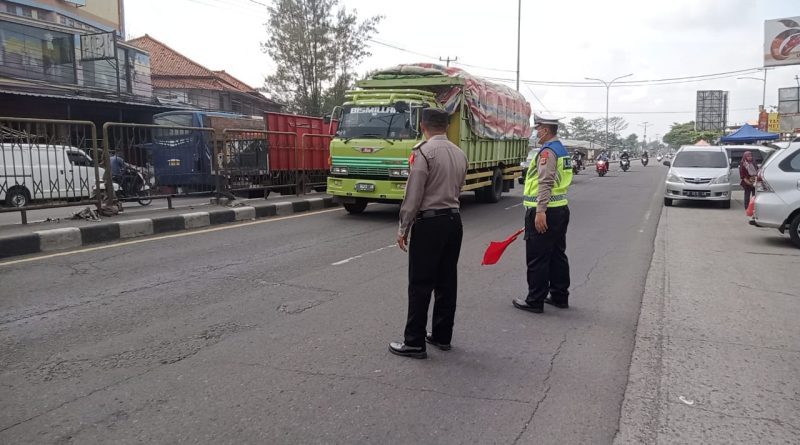 Anggota Pos Pam Jungjang Polresta Cirebon bantu menyebrangkan masyarakat yang merasa kesulitan pada saat hendak menyebrang di jalur By Pass Tegalgubug