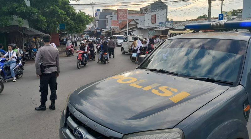 Antisipasi terjadinya kemacetan dan tawuran pelajar, Polsek Lemahabang atur lalu lintas di pertigaan Desa Cipeujeuh Wetan.