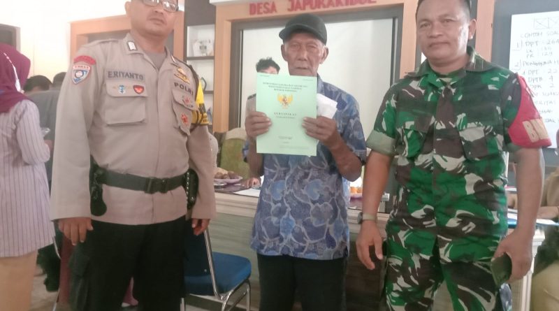 Astanajapura, Bhabinkamtibmas desa Desa Japura Kidul Bripka Edy Riyanto bersama Babinsa Pelda Parsono melaksanakan kegiatan monitoring pendistribusian Sertifikat Tanah program PTSL – PM (Program Pendaftaran Tanah Sistematis Lengkap Partisipasi Masyarakat) di Balai Desa Japura Kidul.(20/02/2024).