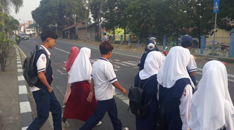Personil Polsek Plered Polresta Cirebon Polda jabar, melaksanakan Gatur Lalu lintas pagi di Jalan Otista di depan Sekolah SDN 3. Tegalsari Kec. Plered Kab. Cirebon.