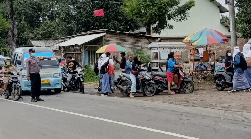 Ka SPK Polsek Waled Polresta Cirebon melaksanakan pengaturan lalu lintas depan SMA Negeri 1 Waled guna memberikan kelancaran kepada pengguna jalan raya dan penyebrangan siswa siswi sekolah