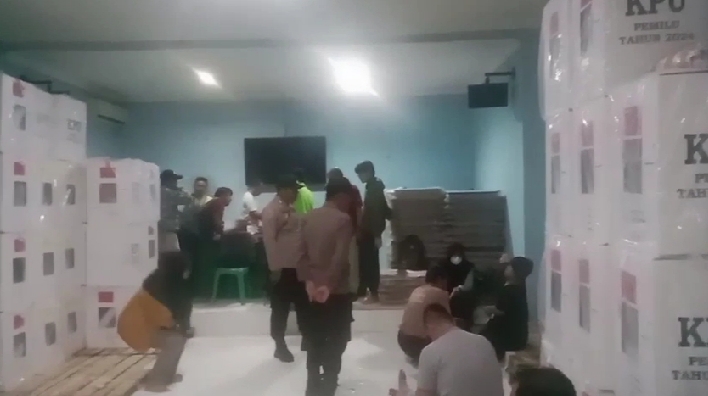 Karangwareng– Kapolsek Karangsembung Akp Agus hermawan.,SH melakukan monitoring dan pengecekan gudang Logistik Pemilu 2024 Kecamatan Karangwareng yang tersimpan di gedung Serbaguna Kecamatan Karangsembung, Minggu malam (04/02/2024).