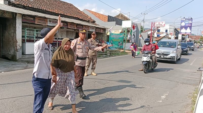Dukupuntang – Selasa (25/04/2023) Personil Pos Pam Dukupuntang Ipda H. Supardi dalam hal ini selaku Pa Pos Pam Regu 1 membantu masyarakat yang akan menyebrang di depan Pos Pam Dukupuntang.