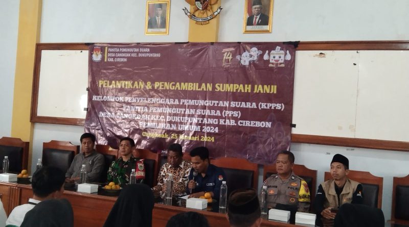 DUKUPUNTANG – Bhabinkamtibmas Polsek Dukupuntang Polresta Cirebon, menghadiri acara pelantikan Kelompok Penyelenggara Pemungutan Suara (KPPS) di desa binaan mereka masing-masing, Kamis (25/01/2024).